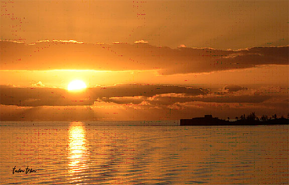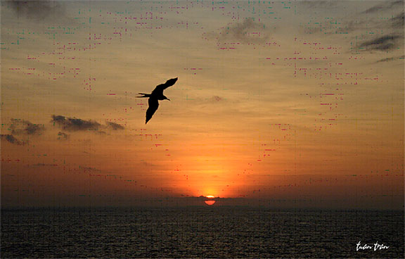 Màu sắc tuy rực rỡ nhưng không lòe loẹt, ánh chiều vàng dọi trong làn sóng rờn rợn của biển sâu xanh thẩm, bầu trời cưu mang hào quang như lời nhắn của thiên nhiên, kêu gọi những cánh chim đơn trên trời kia phải tìm về tổ ấm.